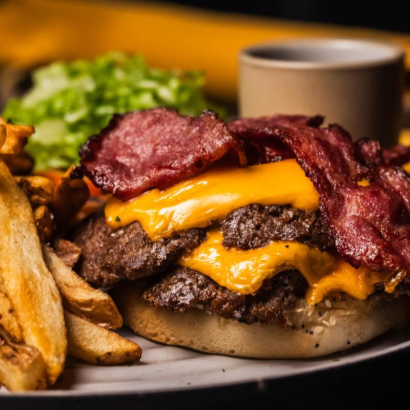 Two juicy 5-oz patties topped with a perfectly fried egg, served on a toasted bun.